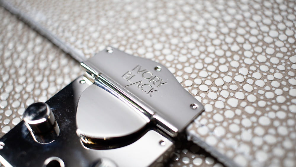 Everyday travel clutch with stingray pattern, silver hardware and canvas interior for easy cleaning.